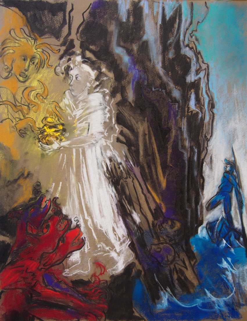 Im Brautkleid, eher ein Leichengewand, wird die schöne Königstochter auf die einsame Felsenspitze gebracht.