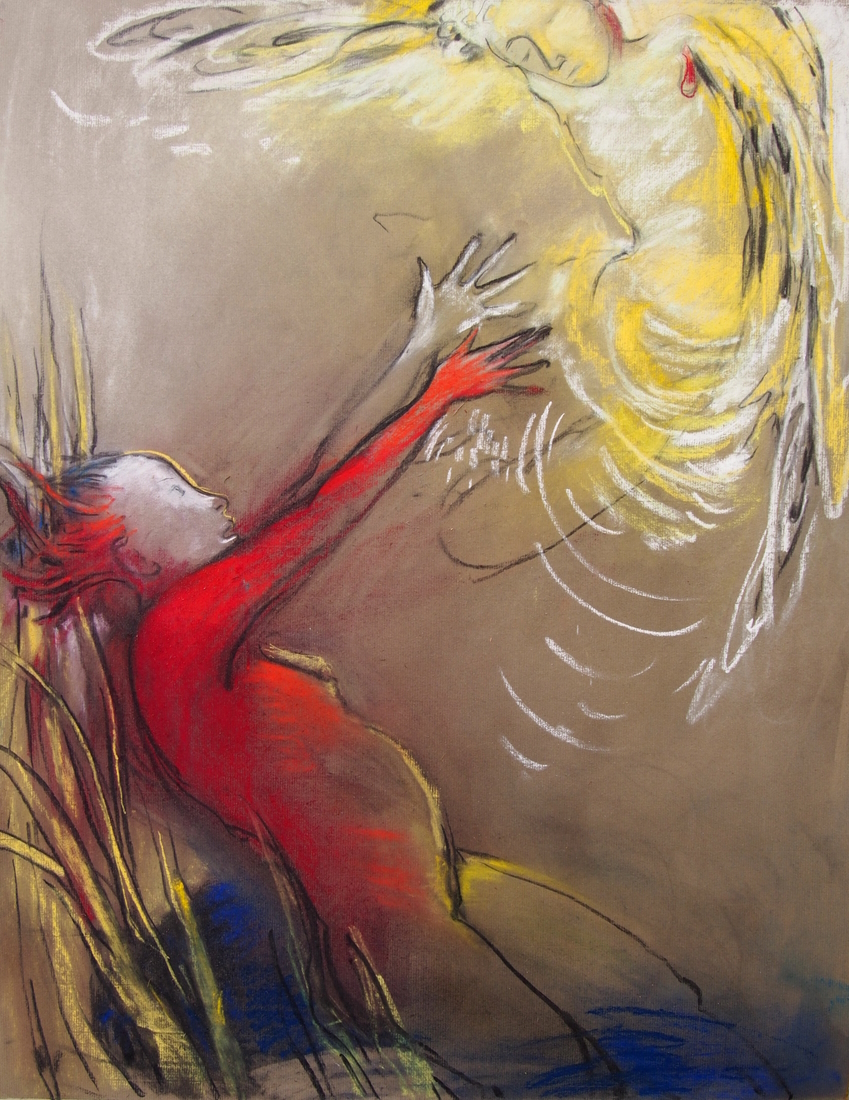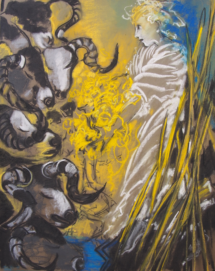 „Die angstvolle und zitternde Psyche jedoch, die auf dem Gipfel des Felsens weinte, trug der linde Hauch des sanft wehenden Zephyrs in ihren schwellenden, sich bauschenden Gewändern sanft… hinab und legte sie im Tal behutsam in den Schoß eines blühenden Rasens.“