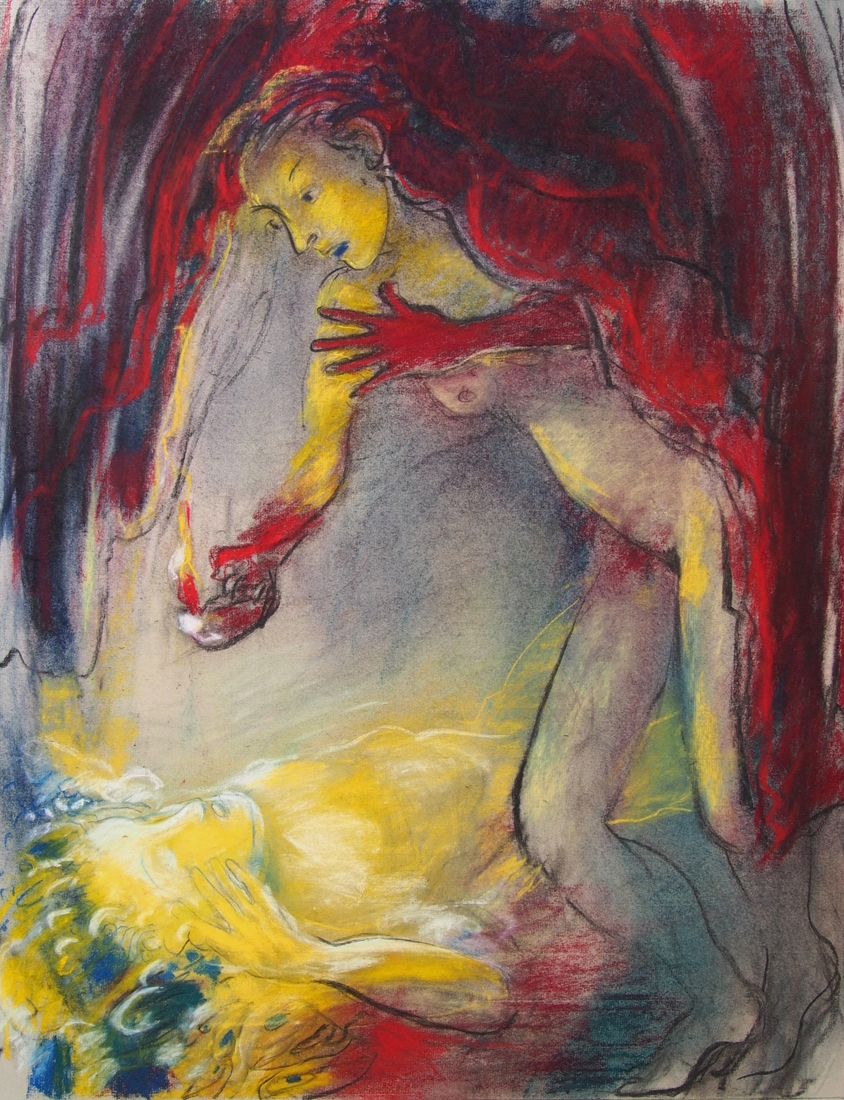 Ratlos und schwankend folgt Psyche schließlich dem Rat ihrer Schwestern: mit einer Öllampe und verborgenem Messer erwartet sie ihren nächtlichen Geliebten.