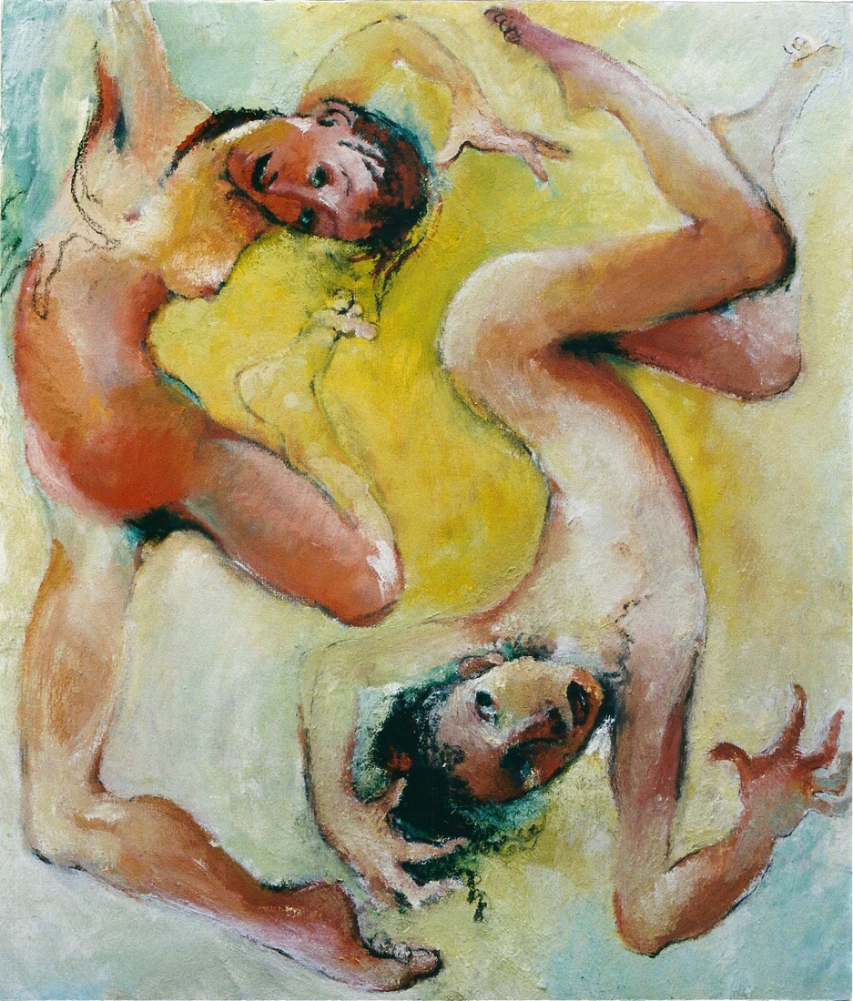 Im weißen Bilduniversum all-umfassender Möglichkeiten stürzt Gelb. Eine Figur bricht um mit Gelb, dem Licht, aber auch im Zwiespalt, im Kontrast von gelber Helligkeit und schwarz-grauer Dunkelheit, sie verkörpert die Dramatik des Umbruchs. Zwei schmale Standpunkte, dazwischen der Ab-Grund in Weiß geben der Gestalt nur wenig Halt. Der labilen Situation erwächst der Aufbruch mit Rot - Rot bricht auf - ein mutiger Schritt, nach rechts aus dem Bild, hin zu neuem Anfang. Energie wird im Rot Bewegung, Feuerflamme und Lebensstrom.