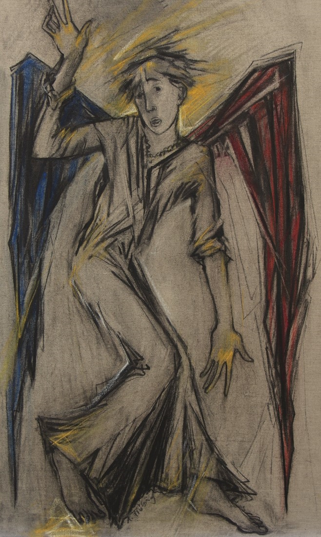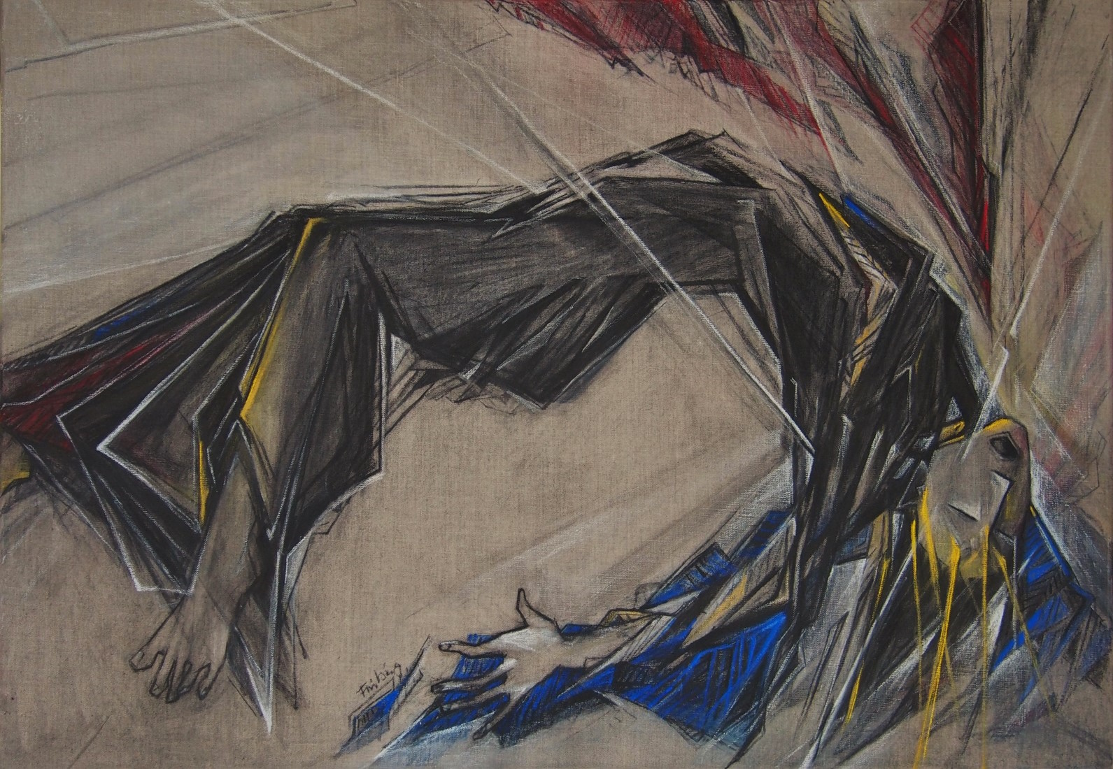 Die Komposition ist aufgebaut aus geometrischen Formen spitzwinkliger Dreiecke. Strahlen, die Licht sein können, strukturieren den Bildraum und erzeugen Rhythmus und Bewegung. Höhungen durch weiße und farbige Kreiden unterstreichen die Expressivität des Werkes.