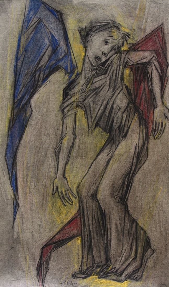 Mein Ausstellungsprojekt in der „Kirche am Weg“ in Dannenwalde gab den Impuls, mich mit Engeln künstlerisch auseinanderzusetzen. Der Innenraum der 200 Jahre alten Kirche ist noch geprägt von Jahrzehnte währender Verwahrlosung und Verfall. Das Relikt eines Epitaphs auf einer Bretterwand gegenüber dem Eingang, einst von einer Engelskulptur bekrönt, bildete den Rahmen für meine erste Engel-Darstellung. Mit der Stürzenden greife ich diesen Gegenstand erneut auf.